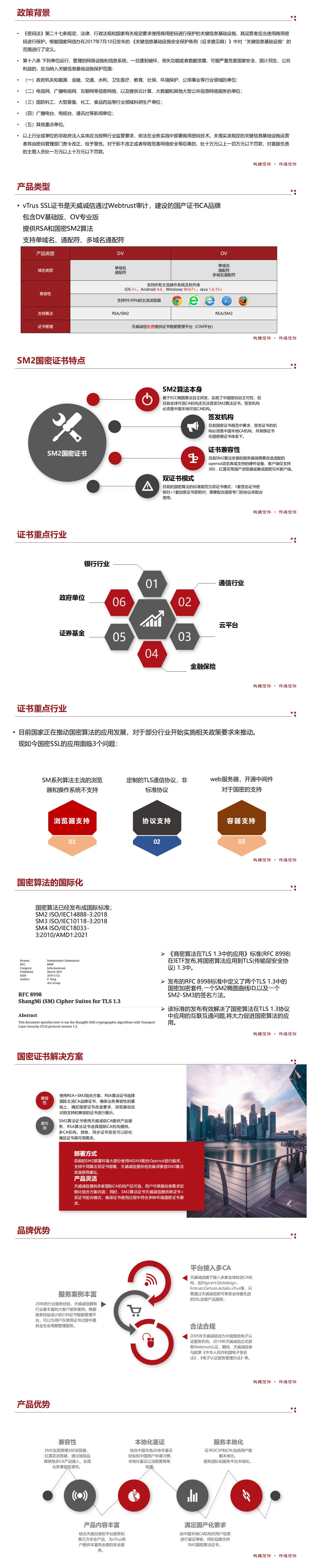 国密SM2+RSA双算法证书,具备高兼容性和高可用性两大优势。 高兼容性:RSA算法证书选择国际主流CA品牌证书,确保业务兼容性的基础上,满足国密SM2算法证书改造要求,浏览器 自动识别支持和兼容的证书进行展示。 高可用性:SM2算法证书使用天威诚信CA提供产品服务,RSA算法证书选择国际CA机构提供。多CA机构、异地、同步证 书签发,可轻松满足证书高可用需求。 通过双证书、双算法并行模式,以及国密应用生态支持体系,构建一系列兼顾国密算法合规和全球通用性的国密证书应用 解决方案,让基于国密算法的应用真正可落地、可实施,帮助政府、企事业单位平滑实现国密算法升级改造,推动国密算 法的普及应用。